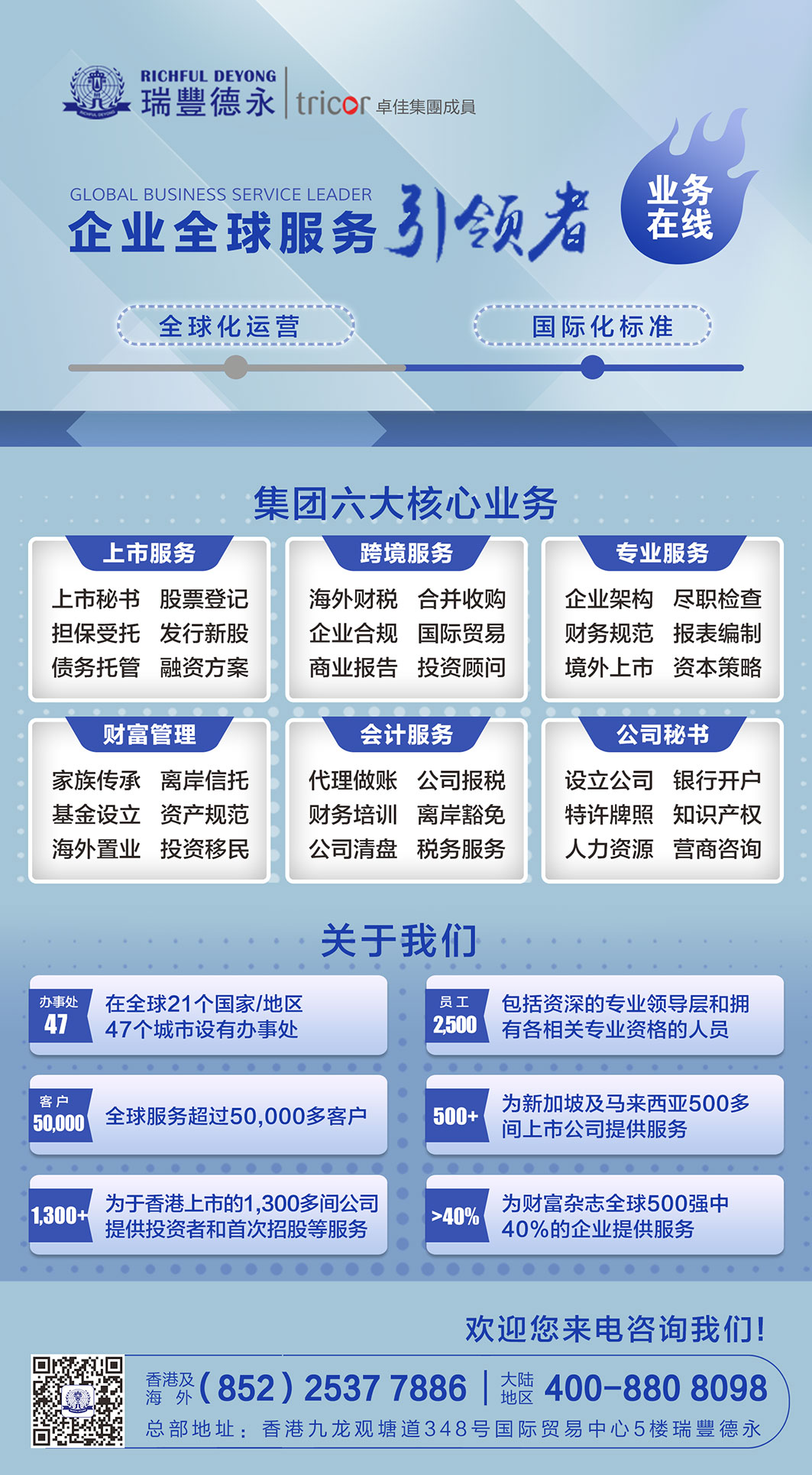 瑞豐德永系TRICOR旗下成員,在全球47個(gè)地區(qū)和新加坡設(shè)有辦事處(地址:80 Robinson Road, #02-00