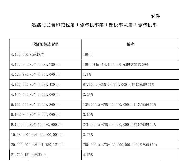 買賣或轉(zhuǎn)讓住宅或非住宅物業(yè)的文書須按物業(yè)售價或價值(以較高者為準)繳付從價印花稅。最低的從價印花稅稅率為一百元,適用于售價或價值為三百萬元或以下的物業(yè)。經(jīng)調(diào)整后,售價或價值為四百萬元或以下的物業(yè)須繳的從價印花稅一律為一百元。計及特別寬減后,預計調(diào)整將惠及約百分之十五的物業(yè)成交個案,政府收入每年減少約四億元。調(diào)整后的稅階見附件。新稅階適用于二零二五年二月二十六日或之后簽立的文書。