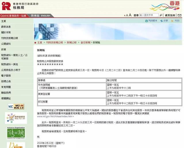 香港特區(qū)政府稅務(wù)局宣布由2月24日起,除商業(yè)登記署、印花稅署、中央詢(xún)問(wèn)處外,仍暫停提供其他服務(wù)。