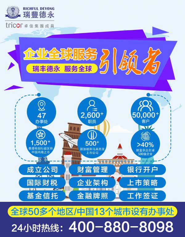 瑞豐德永(Richful Deyong)2008年始創(chuàng)于香港,系卓佳(Tricor)集團成員,是亞洲具有領先地位的專業(yè)服務機構,在全球21個國家/地區(qū)47個城市設有辦事處,擁有2500多名員工,服務超過30000多客戶,1300間香港聯(lián)交所上市公司,500間