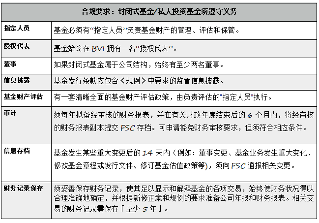?? 長(zhǎng)期以來(lái),在BVI設(shè)立的封閉式基金(如大量的PE/VC基金),并不需要獲得FSC認(rèn)可,幾乎處于監(jiān)管的空白狀態(tài)。SIBA修正案和規(guī)例的出現(xiàn)填補(bǔ)了這一空白,它對(duì)BVI的封閉式基金提出了認(rèn)可要求,同時(shí)對(duì)基金審計(jì)、基金財(cái)產(chǎn)評(píng)估、信息存檔、財(cái)務(wù)記錄保存等日常運(yùn)營(yíng)提出了多方面合規(guī)要求。